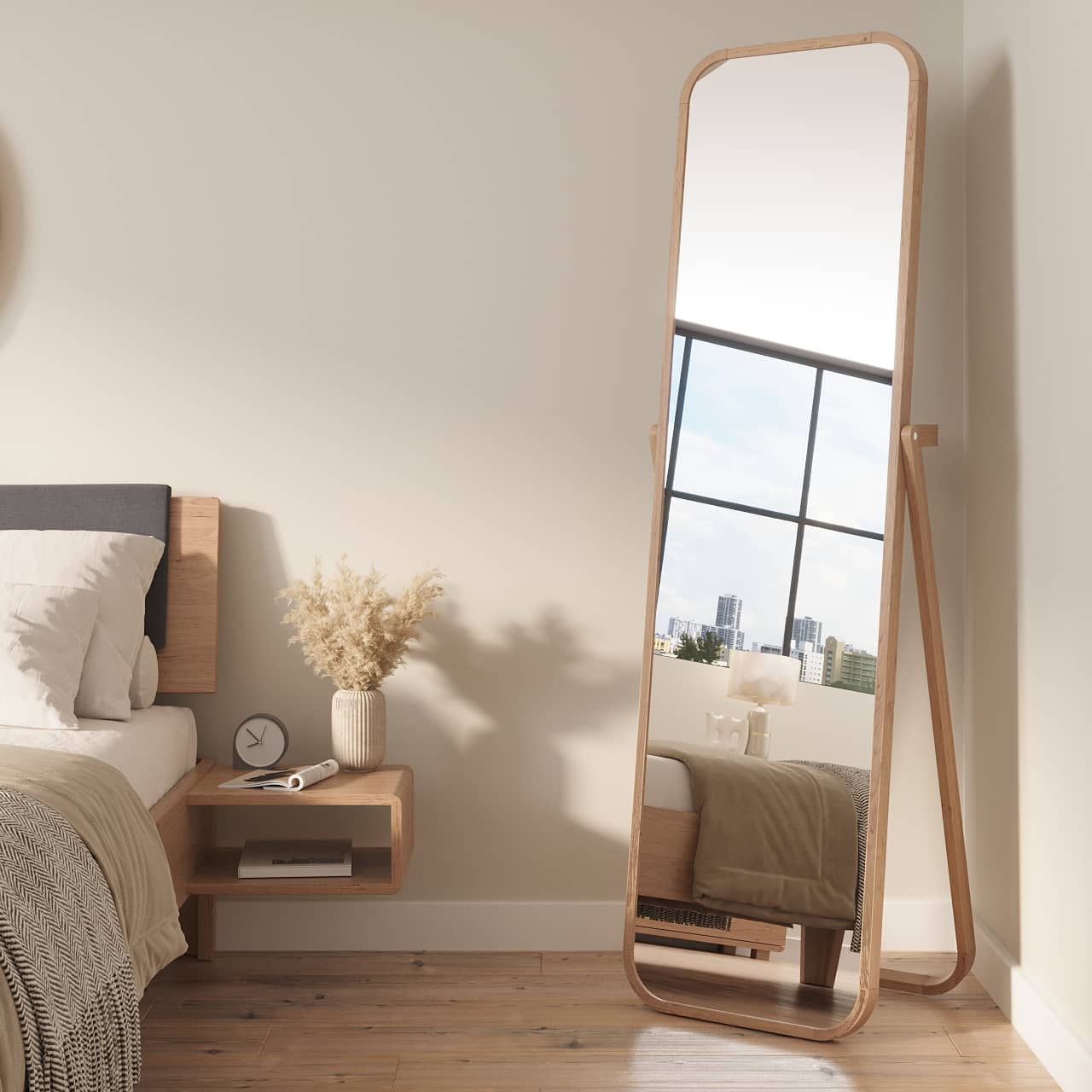 Лаконичные кровати, банкетки, тумбы и зеркала из дуба в скандинавском стиле. Чистые линии и модели без изголовья визуально разгружают спальню и идеально подходят для компактных комнат.